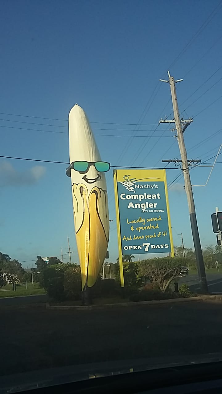 After 1,732 kilometres a silhouette appears on the roadside rapidly taking the shape of a banana. Our overland pursuit of ‘mega fructus’ has finally been rewarded. The connection between a fishing chandlery and bananas remains a mystery to us, but Queensland never promises to be self – explanatory to its East Coast relations.